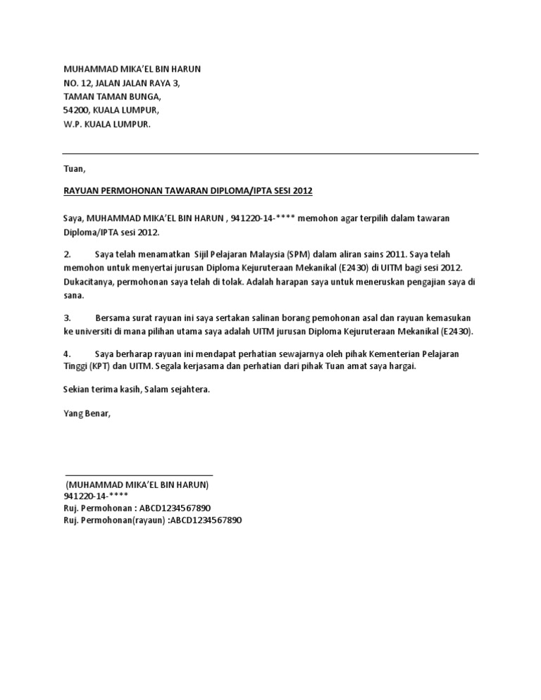Contoh Surat Rasmi Rayuan Kemasukan Ke Universiti Temblor En