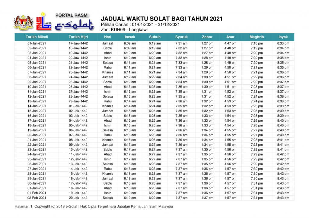 Waktu Solat Kedah 2021 Tahunan 1442h 1443h Jakim Tahun 2020